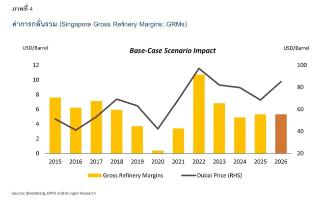 หากสถานการณ์บานปลายสู่ความขัดแย้งเต็มรูปแบบในภูมิภาค (Worse-Case) จะเป็นแรงกดดันต่อค่าการกลั่นรวม (Gross Refinery Margins: GRMs) ของโรงกลั่นน้ำมันให้ลดลงอย่างมีนัยสำคัญ เนื่องจาก