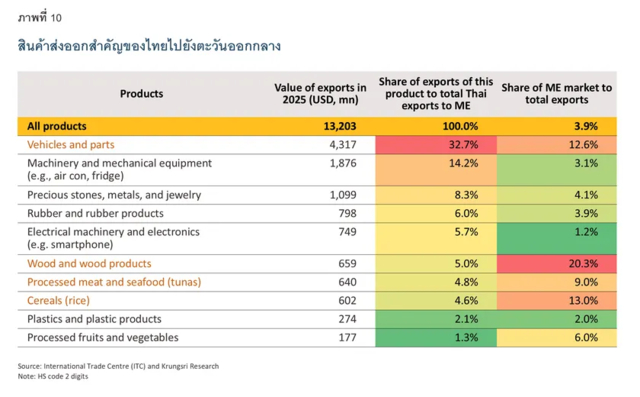 ในตลาดตะวันออกกลาง ไทยมีสินค้าส่งออกสำคัญ ได้แก่ ยานยนต์และชิ้นส่วน อาหาร (ทูน่าและข้าว) เครื่องปรับอากาศ เครื่องประดับ อุปกรณ์อิเล็กทรอนิกส์ ยาง และไม้ ซึ่งส่วนใหญ่เป็นสินค้าส่งออกหลักของไทย สะท้อนว่าหากสถานการณ์ในภูมิภาคมีความตึงเครียดและยืดเยื้อจนทำให้กำลังซื้อของตลาดชะลอตัว ผู้ส่งออกไทยในกลุ่มสินค้าเหล่านี้อาจได้รับผลกระทบด้วย