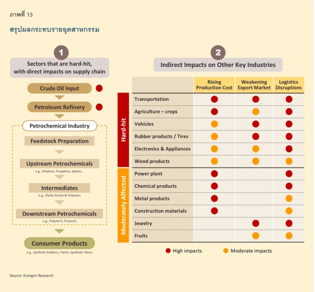 ความขัดแย้งในตะวันออกกลางอาจส่งผลกระทบต่อภาคอุตสาหกรรมไทยในหลายมิติ โดยสามารถแบ่งออกได้เป็นผลกระทบทางตรงและทางอ้อมได้ดังนี้