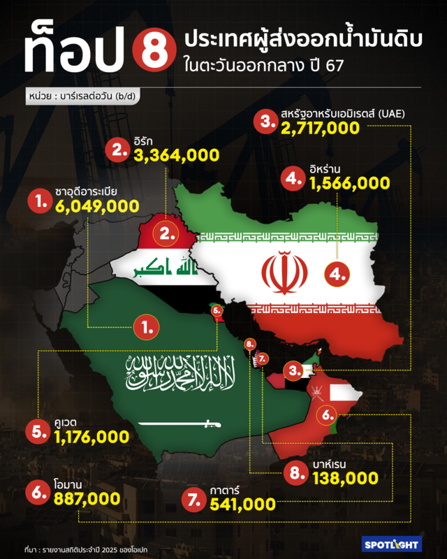ข้อมูลขององค์การกลุ่มประเทศผู้ส่งออกน้ำมัน หรือโอเปก (OPEC) ระบุ 8 อันดับประเทศผู้ส่งออกน้ำมันดิบมากที่สุดในตะวันออกกลางในปี 2567 ดังนี้