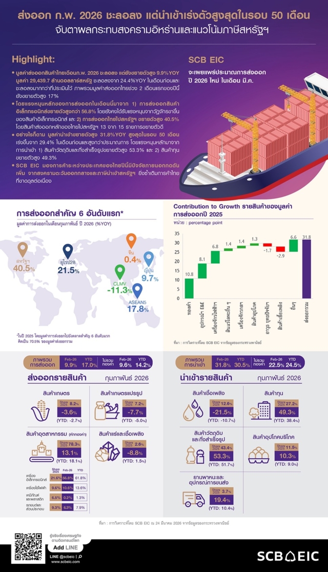 อย่างไรก็ตาม ด้านการนำเข้าอยู่ที่ 32,273.3 ล้านดอลลาร์สหรัฐ ขยายตัวสูงถึง 31.8%YOY ซึ่งเป็นระดับสูงสุดในรอบ 50 เดือน และสูงกว่าที่ตลาดประเมิน ส่งผลให้ดุลการค้าเดือนนี้ขาดดุล -2,833.6 ล้านดอลลาร์สหรัฐ และทำให้ 2 เดือนแรกของปีขาดดุลสะสม -6,137.1 ล้านดอลลาร์สหรัฐ ท่ามกลางความเสี่ยงจากสงครามอิหร่านและแนวโน้มมาตรการภาษีนำเข้าสหรัฐฯ ที่อาจกดดันทิศทางการค้าไทยในระยะถัดไป