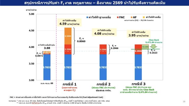 จากสถานการณ์ดังกล่าว ดร.พูลพัฒน์ เปิดเผยว่า ในการประชุม กกพ. ครั้งที่ 10/2569 (ครั้งที่ 1000) มีมติให้เปิดรับฟังความคิดเห็นค่าไฟฟ้าผันแปร หรือค่าเอฟที (ค่า FT) สำหรับการเรียกเก็บค่าไฟฟ้าสำหรับงวด พ.ค. - ส.ค. 69 เป็น 3 กรณี โดยเรียกเก็บที่ 3.95-4.59 บาทต่อหน่วย