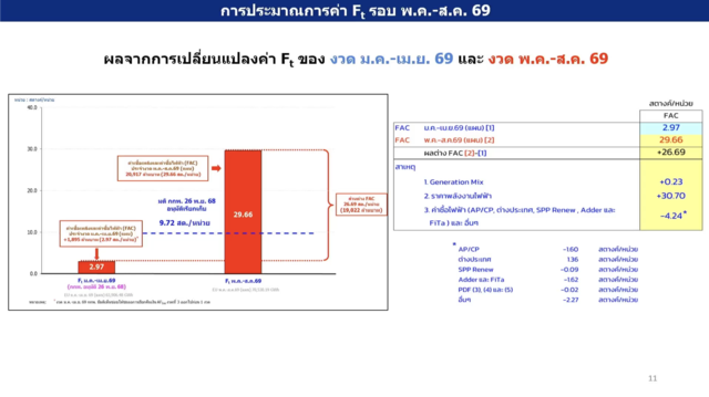 จากการประมวลผลต้นทุนในรอบเดือนพฤษภาคม-สิงหาคม พบว่าค่าเชื้อเพลิงและค่าซื้อไฟฟ้า (FAC) จะเพิ่มขึ้นจากช่วงเดือนมกราคม-เมษายน มาอยู่ที่ 29.66 สตางค์ต่อหน่วย โดยมีปัจจัยสำคัญจากราคาพลังงานไฟฟ้าที่มีสัดส่วนสูงถึง 30.70 สตางค์ต่อหน่วย ซึ่งเป็นตัวขับเคลื่อนหลักของการปรับขึ้นค่าไฟในรอบนี้