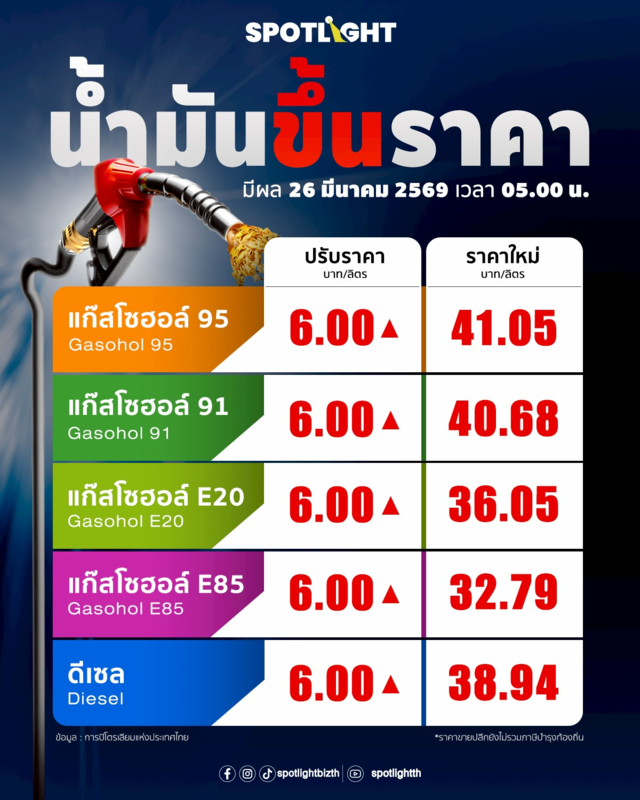 วันที่ 25 มีนาคม 2569 คณะกรรมการบริหารกองทุนน้ำมันเชื้อเพลิง (กบน.) มีมติเห็นชอบในการปรับลดอัตราชดเชยราคาน้ำมันดีเซลและกลุ่มเบนซิน ทำให้ราคาขายปลีกน้ำมันทุกชนิด ในวันพรุ่งนี้ (26 มีนาคม 2569) จะปรับขึ้น 6 บาทต่อลิตร ซึ่งการปรับราคาเป็นผลมาจากสถานการณ์ความตึงเครียดในตะวันออกกลาง ส่งผลให้ระดับราคาน้ำมันมีการปรับตัวสูงขึ้นอย่างต่อเนื่อง และทำให้ราคาน้ำมันดีเซลในตลาดสิงคโปร์ดีดตัวสูงขึ้นอย่างรุนแรง จาก 198.20 เหรียญสหรัฐต่อบาร์เรลในวันที่ 23 มีนาคม 2569 พุ่งสูงถึง 242.91 เหรียญสหรัฐต่อบาร์เรลในวันที่ 23 มีนาคม 2569