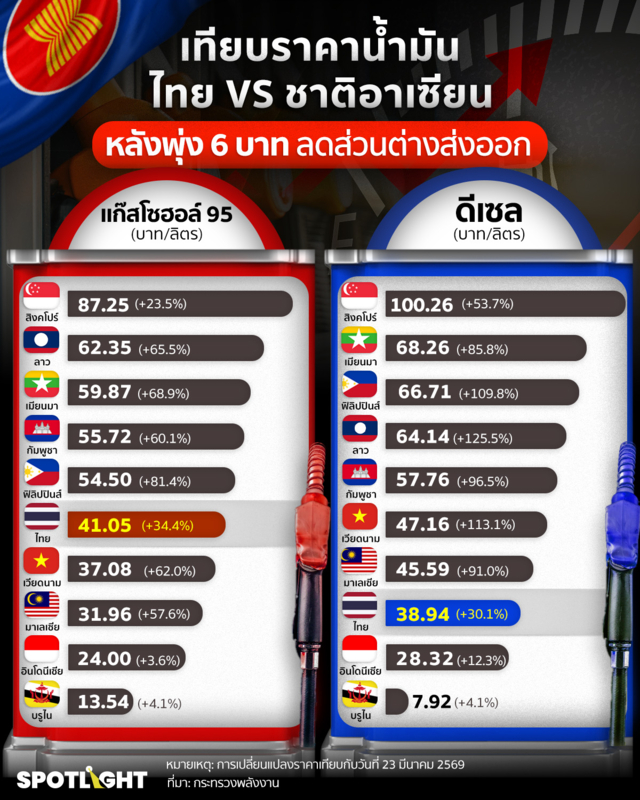 ด้านน้ำมันดีเซล ซึ่งเป็นต้นทุนหลักของภาคขนส่งและเศรษฐกิจฐานราก พบว่าราคามีความผันผวนสูงกว่า โดยสิงคโปร์ยังคงมีราคาสูงสุดที่ 100.26 บาทต่อลิตร เพิ่มขึ้น +53.7% รองลงมาคือ เมียนมา 68.26 บาท (+85.8%) ฟิลิปปินส์ 66.71 บาท (+109.8%) ลาว 64.14 บาท (+125.5%) และกัมพูชา 57.76 บาท (+96.5%) ขณะที่เวียดนามอยู่ที่ 47.16 บาท (+113.1%) และมาเลเซีย 45.59 บาท (+91.0%) ส่วนประเทศไทยอยู่ที่ 38.94 บาทต่อลิตร เพิ่มขึ้น +30.1% ต่ำกว่าประเทศส่วนใหญ่ในกลุ่มนี้ แต่ยังสูงกว่าอินโดนีเซีย 28.32 บาท (+12.3%) และบรูไน 7.92 บาท (+4.1%) ซึ่งยังคงเป็นประเทศที่มีราคาดีเซลต่ำที่สุด
