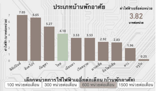 ข้อมูลจาก คณะกรรมการกำกับกิจการพลังงาน หรือ กกพ. ระบุว่า ณ วันที่ 13 มีนาคม 2569 หากอ้างอิงจากระดับการใช้ไฟฟ้าเฉลี่ยที่ 600 หน่วยต่อเดือน ซึ่งสะท้อนต้นทุนการใช้พลังงานในชีวิตจริงของครัวเรือนขนาดกลาง ค่าไฟฟ้าของไทยจะอยู่ที่ 4.18 บาทต่อหน่วย อยู่ในระดับกลางค่อนไปทางบนเมื่อเทียบกับค่าไฟฟ้าในประเทศอื่นๆ ในภูมิภาคอาเซียน