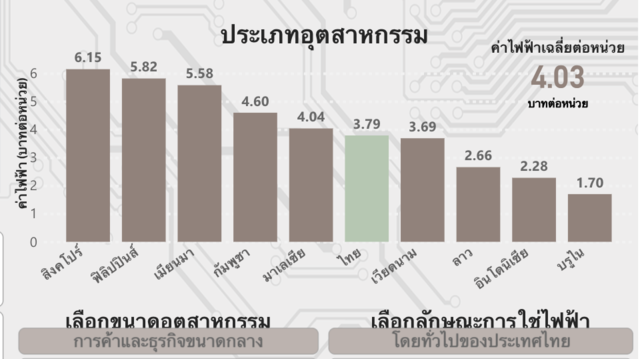 สำหรับประเทศไทย ตัวเลข 3.79 บาทต่อหน่วย แสดงให้เห็นตำแหน่งของไทยในฐานะ “ค่ากลางของภูมิภาค” โดยอยู่ต่ำกว่ากัมพูชาเล็กน้อย และแทบเทียบเท่ามาเลเซีย แต่ยังสูงกว่าเวียดนามที่อยู่ที่ 3.69 บาทต่อหน่วย ซึ่งถือเป็นคู่แข่งสำคัญด้านการผลิตในภูมิภาค
