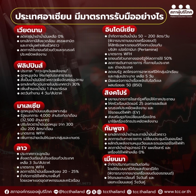 ในบริบทนี้ รัฐบาลของแต่ละประเทศในอาเซียนจึงต้องใช้มาตรการที่หลากหลาย ตั้งแต่การควบคุมการใช้พลังงาน การลดภาษี การอุดหนุนเฉพาะกลุ่ม ไปจนถึงการเร่งเปลี่ยนผ่านสู่พลังงานทางเลือก เพื่อบรรเทาผลกระทบทั้งในระยะสั้นและระยะยาว ท่ามกลางความผันผวนของตลาดพลังงานโลกที่ยังคงดำเนินต่อเนื่อง