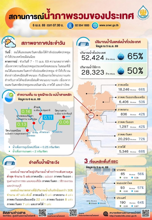 สถานการณ์ดังกล่าวเกิดขึ้นท่ามกลางสภาพอากาศที่ยังไม่เอื้อต่อการเติมน้ำต้นทุน โดยลมใต้และลมตะวันตกเฉียงใต้กำลังอ่อนพัดปกคลุมประเทศไทย ทำให้หลายพื้นที่มีฝนน้อย แม้ช่วงวันที่ 7-11 เมษายน จะมีโอกาสเกิดฝนฟ้าคะนองจากความกดอากาศต่ำ แต่ลักษณะฝนยังคงกระจายตัวและไม่เพียงพอที่จะพลิกฟื้นระดับน้ำในระบบได้ในระยะสั้น ส่งผลให้ความเสี่ยงของภาวะแล้งยังคงกดดันประเทศไทยอย่างต่อเนื่อง