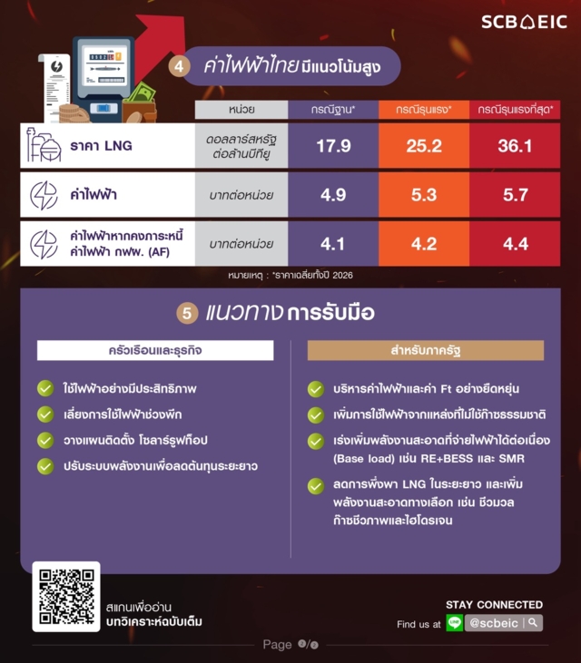SCB EIC ประเมินว่า การเร่งจัดหาก๊าซธรรมชาติเหลว (LNG) ทดแทนในตลาดจร (Spot Market) ที่มีราคาสูงขึ้น จะส่งผลให้ต้นทุนค่าไฟฟ้าของประเทศไทยเพิ่มขึ้นและทรงตัวในระดับสูงอย่างน้อย 2 ปี โดยก่อนเกิดสถานการณ์สงคราม ประเมินว่าราคา LNG (JKM) นำเข้าเฉลี่ยในปี 2026 จะอยู่ที่ 11.3 ดอลลาร์สหรัฐต่อล้านบีทียู และค่าไฟฟ้าเฉลี่ยจะอยู่ที่ประมาณ 3.9 บาทต่อหน่วย