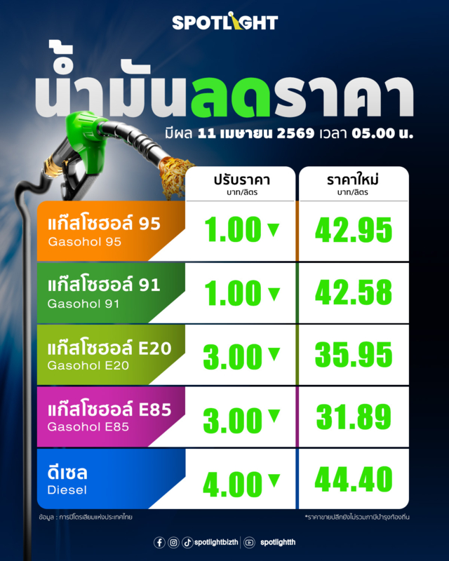 (10 เมษายน 2569) คณะกรรมการบริหารกองทุนน้ำมันเชื้อเพลิง (กบน.) โดยนายเอกนัฏ พร้อมพันธุ์ รัฐมนตรีว่าการกระทรวงพลังงาน ในฐานะประธาน เปิดเผยภายว่า ที่ประชุม กบน. มีมติเห็นชอบให้สะท้อนราคากลไกตลาดโลกที่มีทิศทางอ่อนตัวลง โดยราคาตลาดน้ำมันโลกวันที่ 9 เมษายน ปิดอยู่ที่ประมาณ 211 เหรียญสหรัฐฯ ต่อบาร์เรล ปรับลดลงจากวันที่ 7 เมษายน ที่ปิดที่ประมาณ 255 เหรียญสหรัฐฯ ต่อบาร์เรล ด้วยการปรับอัตราเงินกองทุนน้ำมันเชื้อเพลิง โดยมีผลตั้งแต่วันที่ 11 เมษายน 2569 ดังนี้