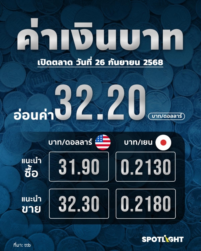 ฝ่ายธุรกิจตลาดเงินและธุรกรรมระหว่างประเทศ ทีเอ็มบีธนชาต (ttb) เปิดเผยว่า ค่าเงินบาทเช้านี้เปิดตลาด 32.20 บาท/ดอลลาร์ อ่อนค่าจากราคาปิดตลาดเมื่อวานที่ระดับ 32.15 บาท/ดอลลาร์