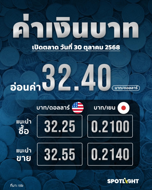 ฝ่ายธุรกิจตลาดเงินและธุรกรรมระหว่างประเทศ ทีเอ็มบีธนชาต (ttb) เปิดเผยว่า ค่าเงินบาทเช้านี้เปิดตลาด 32.40 บาท/ดอลลาร์ อ่อนค่าจากราคาปิดตลาดเมื่อวานที่ระดับ 32.27 บาท/ดอลลาร์