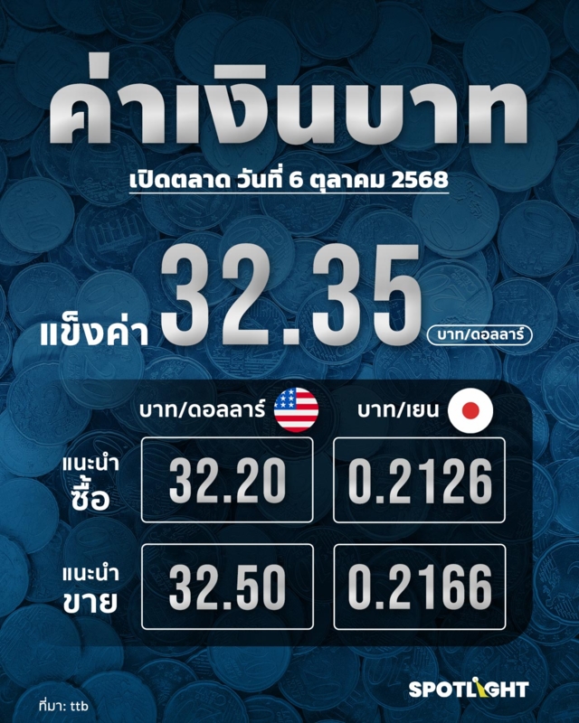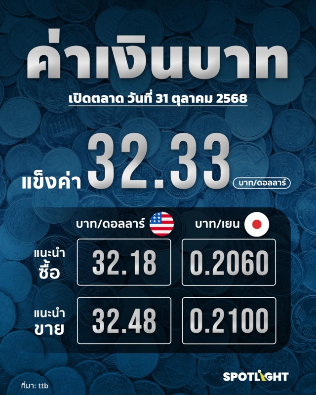 ฝ่ายธุรกิจตลาดเงินและธุรกรรมระหว่างประเทศ ทีเอ็มบีธนชาต (ttb) เปิดเผยว่า ค่าเงินบาทเช้านี้เปิดตลาด 32.33 บาท/ดอลลาร์สหรัฐ แข็งค่าเล็กน้อย เมื่อเทียบกับราคาปิดตลาดเมื่อวาน ที่ 32.37 บาท/ดอลลาร์สหรัฐ
