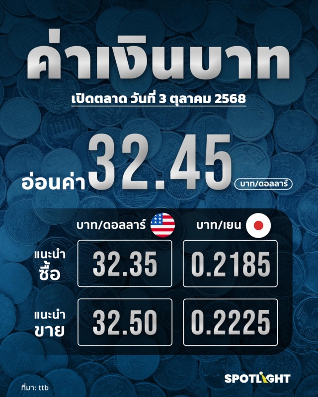 ฝ่ายธุรกิจตลาดเงินและธุรกรรมระหว่างประเทศ ทีเอ็มบีธนชาต (ttb) เปิดเผยว่า ค่าเงินบาทเช้านี้เปิดตลาด 32.50 บาท/ดอลลาร์ เแข็งค่าจากราคาปิดตลาดเมื่อวานที่ระดับ 32.56 บาท/ดอลลาร์