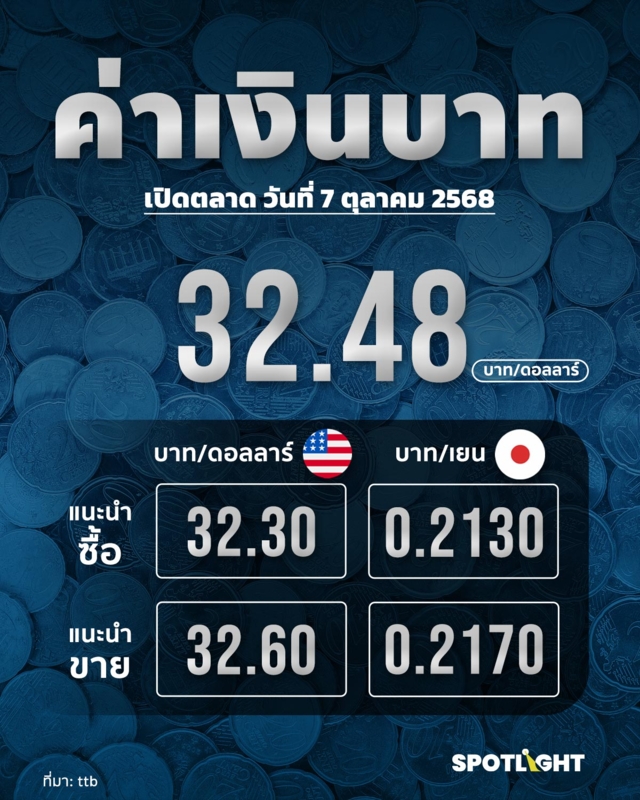 ฝ่ายธุรกิจตลาดเงินและธุรกรรมระหว่างประเทศ ทีเอ็มบีธนชาต (ttb) เปิดเผยว่า ค่าเงินบาทเช้านี้เปิดตลาด 32.48 บาท/ดอลลาร์ใกล้เคียงกับราคาปิดตลาดเมื่อวานที่ 32.46 บาท/ดอลลาร์