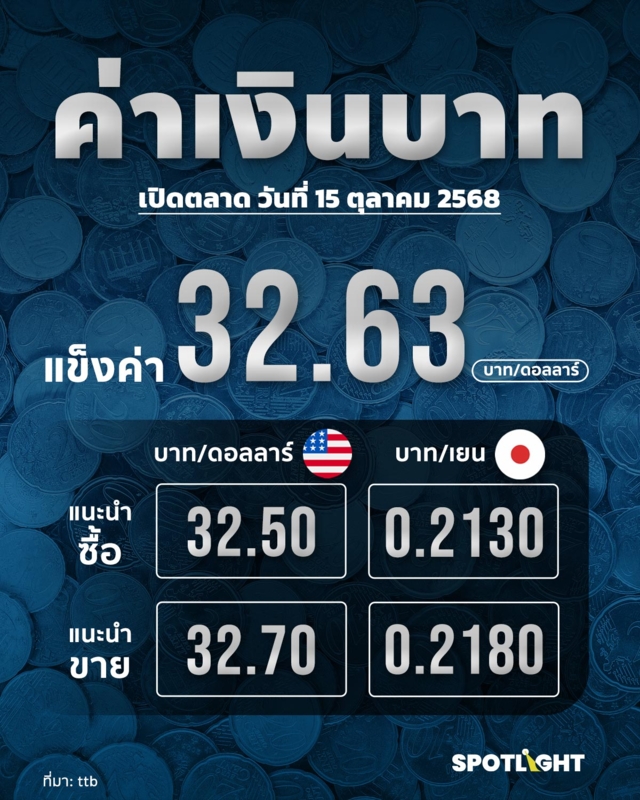 ฝ่ายธุรกิจตลาดเงินและธุรกรรมระหว่างประเทศ ทีเอ็มบีธนชาต (ttb) เปิดเผยว่า ค่าเงินบาทเช้านี้เปิดตลาด 32.63 บาท/ดอลลาร์ เแข็งค่าจากราคาปิดตลาดเมื่อวานที่ระดับ 32.80 บาท/ดอลลาร์