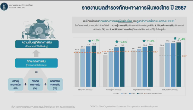 คุณดารณี แซ่จู ผู้ช่วยผู้ว่าการสายกำกับระบบการชำระเงินและคุ้มครองผู้ใช้บริการทางการเงิน ธนาคารแห่งประเทศไทย กล่าวถึงภาพรวมของสถานการณ์ทางการเงินของคนไทยในมิติของ “ความพร้อมเกษียณ” ว่ายังอยู่ในระดับที่น่ากังวล แม้ผลสำรวจล่าสุดของธนาคารแห่งประเทศไทยจะสะท้อนว่าทักษะทางการเงินของคนไทยดีขึ้นในทุกด้าน ทั้งความรู้ ความเข้าใจ ทัศนคติ และพฤติกรรม แต่เมื่อพิจารณาเชิงลึกยังพบว่าความรู้เหล่านั้นยังไม่ถูกนำไปใช้จริงอย่างเป็นรูปธรรม โดยเฉพาะในเรื่องการออมเพื่ออนาคตและการเตรียมเงินสำรองยามฉุกเฉิน