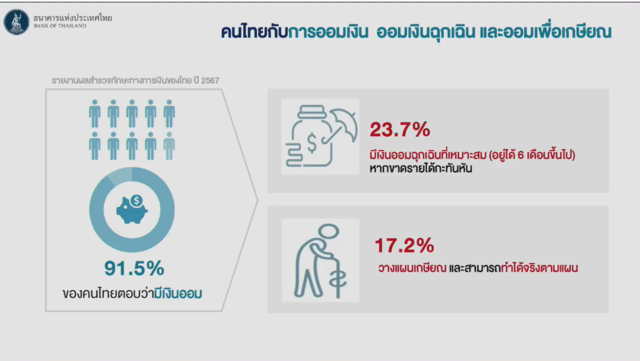 จากผลสำรวจ พบว่าคนไทยกว่า 80% บอกว่ามีการวางแผนเกษียณ แต่เมื่อดูจากพฤติกรรมจริง มีเพียงราว 17% ที่สามารถทำได้ตามแผน นั่นหมายความว่าคนส่วนใหญ่ยังไม่สามารถจัดการรายได้ รายจ่าย และการออมให้สอดคล้องกับเป้าหมายในชีวิตได้อย่างมีวินัย ขณะเดียวกัน แม้คนไทยกว่า 90% จะบอกว่ามีเงินออม แต่ส่วนใหญ่เป็นการออมเพื่อใช้จ่ายในชีวิตประจำวัน ไม่ใช่เพื่อรองรับเหตุการณ์ไม่คาดฝัน หรือวางแผนเกษียณในระยะยาว ผลสำรวจยังระบุว่า มีเพียงเกือบหนึ่งในสี่ของประชากร หรือ 23.7% เท่านั้นที่มีเงินสำรองเพียงพอสำหรับใช้จ่ายได้เกินหกเดือน หากเกิดเหตุฉุกเฉิน เช่น ตกงานหรือเจ็บป่วย