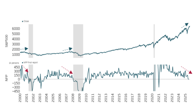 ในอดีต เราเคยเห็นการเปลี่ยนแปลงลักษณะนี้ชัดเจน เช่น ในปี 2000 ก่อนตลาด Dot-com จะเข้าสู่ขาลง หรือในช่วงปี 2007 ก่อนเกิดวิกฤติซับไพรม์ โดยสัญญาณที่นำตลาดเข้าสู่โหมด “Bad News is Bad News” คือ ตัวเลขการจ้างงานใหม่ลดลงต่ำกว่า 50,000 ตำแหน่งต่อเดือน พร้อมกับมีการเลิกจ้างในหลายภาคธุรกิจ