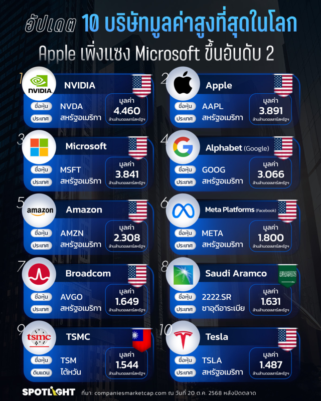 ราคาหุ้น Apple (Nasdaq: AAPL) พุ่งทำระดับสูงสุดตลอดกาล (all-time high) เมื่อวันจันทร์ที่ 20 ตุลาคม 2025 ทำให้ Apple เกือบจะได้เป็นบริษัทที่สามของโลกที่มีมูลค่าตามราคาตลาด (market cap) ถึง 4 ล้านล้านดอลลาร์สหรัฐฯ ซึ่งสองบริษัทที่ทำได้ก่อนหน้านี้ คือ Nvidia และ Microsoft