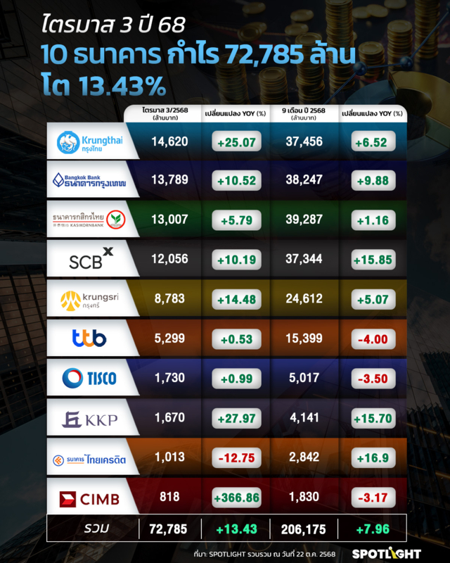 สำหรับ 10 ธนาคารที่ SPOTLIGHT รวบรวมข้อมูล มีผลกำไรในไตรมาส 3 และงวด 9 เดือน ปี 2568 ดังนี้