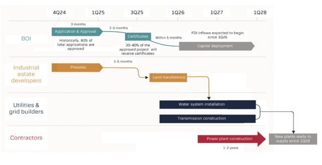 โดยทั่วไป การลงทุนขนาดใหญ่ในไทย โดยเฉพาะโครงการจากนักลงทุนต่างชาติ (FDI) จะเริ่มจากการจองซื้อที่ดินในนิคมอุตสาหกรรม (Presales) และยื่นคำขอรับการส่งเสริมการลงทุน (BOI Application) ภายในระยะเวลาใกล้เคียงกัน จากนั้นราว 1–3 เดือน คำขอจะเข้าสู่กระบวนการอนุมัติ (Approval) และต่อเนื่องด้วยการออกบัตรส่งเสริมฯ ภายในอีก 3–6 เดือน เมื่อได้รับบัตรแล้ว นักลงทุนส่วนใหญ่จะเริ่มเบิกจ่ายเม็ดเงินลงทุนจริง (Capex Disbursement) ภายในครึ่งปี ซึ่งหมายความว่าโดยเฉลี่ยแล้ว เม็ดเงินลงทุนจริงจะเริ่มเข้าสู่ระบบเศรษฐกิจภายใน 12 เดือนหลังการอนุมัติ/ออกบัตร BOI และทยอยกระจายออกในช่วง 2–3 ปีถัดมา