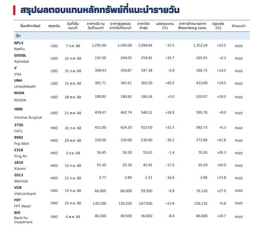 ตารางสรุปผลตอบแทนหุ้นต่างประเทศแนะนำ