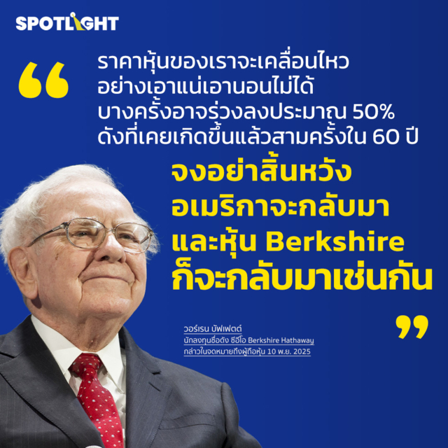 วอร์เรน บัฟเฟตต์ (Warren Buffett) มหาเศรษฐี-นักลงทุนผู้เป็นตำนานของโลก เผยแพร่จดหมายถึงผู้ถือหุ้น Berkshire Hathaway (เบิร์กเชียร์ แฮทาเวย์) ในฐานะประธานเจ้าหน้าที่บริหาร หรือซีอีโอบริษัทเป็นครั้งสุดท้าย เมื่อวันที่ 10 พฤศจิกายน 2025 ก่อนที่จะลงจากตำแหน่งในสิ้นปีนี้ และขยับไปเป็นประธานบริษัทในต้นปีหน้า