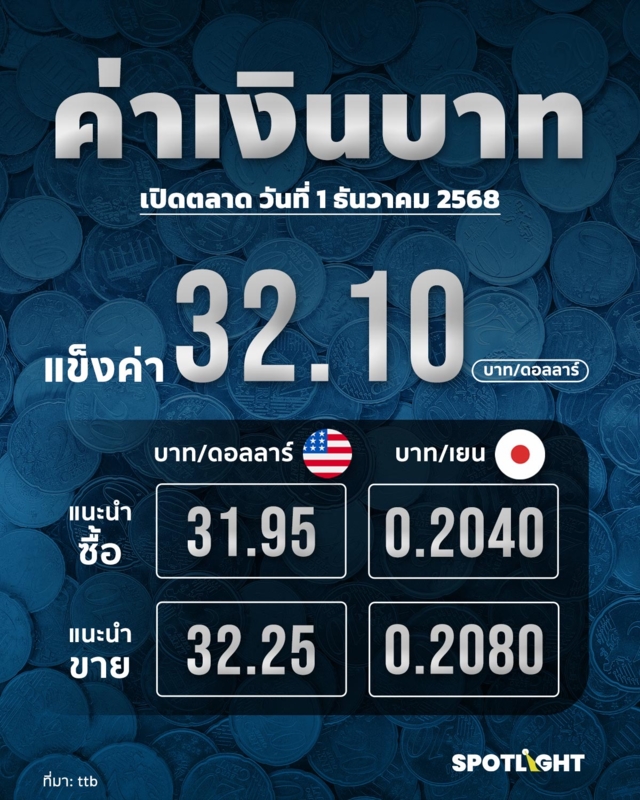 ฝ่ายธุรกิจตลาดเงินและธุรกรรมระหว่างประเทศ ทีเอ็มบีธนชาต (ttb) เปิดเผยว่าค่าเงินบาทเช้านี้เปิดตลาด 32.10 บาท/ดอลลาร์สหรัฐปรับตัวแข็งค่า เมื่อเทียบกับราคาปิดตลาดเมื่อวันศุกร์ที่ 32.22 บาท/ดอลลาร์สหรัฐ