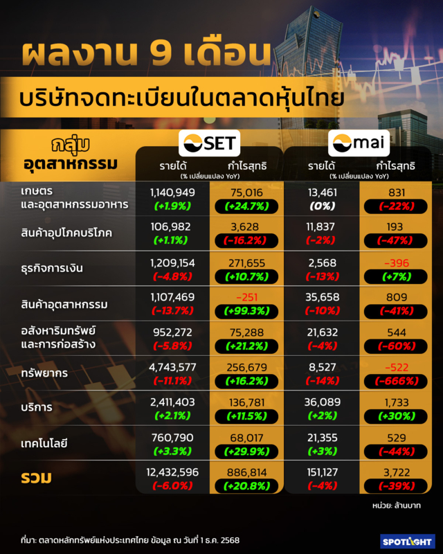 ผลการดำเนินงานงวด 9 เดือนแรกปี 2568 เทียบกับช่วงเดียวกันปีก่อน บจ.ใน SET มียอดขาย (รายได้) 12,432,596 ล้านบาท ลดลง 6.0% ต้นทุนการผลิตและค่าใช้จ่ายการขายและบริหารลดลง 6.6% และ 1.2% ตามลำดับ ทำให้ บจ. มีกำไรจากการดำเนินงานหลัก (Core profit) 844,047 ล้านบาท ลดลง 7.3% อย่างไรก็ตาม บจ. ขนาดใหญ่หลายแห่งมีกำไรจากการควบรวมกิจการ การปรับโครงสร้างธุรกิจ และการลงทุนเพิ่มขึ้น ส่งผลให้ บจ. มีกำไรสุทธิ 886,814 ล้านบาท เพิ่มขึ้น 20.8%