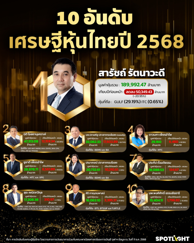 10 อันดับเศรษฐีหุ้นไทยในปีนี้ ใครขึ้น ใครลง ใครเข้ามาอยู่ในท็อป 10 ได้ครั้งแรก ใครมีความมั่งคั่งลดลงเท่าไร มาดูกันเลย