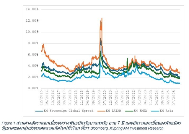 เราจึงมองว่า ในปีหน้า ตราสารหนี้ตลาดเกิดใหม่ ที่ประเทศซึ่งสามารถลดดอกเบี้ยได้ยังอยู่ในกลุ่มเหล่านี้ และมีโอกาสที่จะปรับตัวเพิ่มขึ้นตามดอกเบี้ยที่ลดลง โดยให้ภูมิภาคละตินอเมริกาขึ้นมาโดดเด่นมากที่สุด ตามมาด้วยภูมิภาคยุโรป ตะวันออกกลาง และเอเชีย ซึ่งเอเชียจะได้ประโยชน์น้อยที่สุด จากอัตราดอกเบี้ยที่อยู่ในระดับต่ำอยู่แล้ว และส่วนต่างดอกเบี้ยยังไม่มากพอเมื่อเทียบกับภูมิภาคอื่น