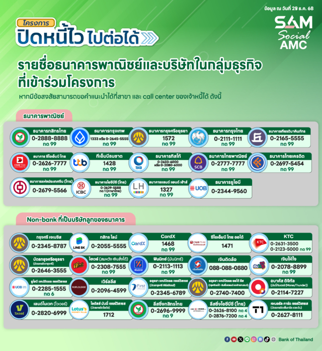 นางสาวนารถนารี รัฐปัตย์ กรรมการผู้จัดการ บริษัทบริหารสินทรัพย์สุขุมวิท จำกัด (SAM) เปิดเผยว่า โครงการนี้เริ่มเปิดรับสมัครตั้งแต่วันที่ 5 มกราคม 2569 เพื่อช่วยลูกหนี้รายย่อยที่เป็น หนี้เสีย (NPLs) ไม่มีหลักประกัน เช่น บัตรเครดิต สินเชื่อส่วนบุคคล และติ่งหนี้ของหนี้ที่เคยมีหลักประกัน ค้างชำระเกิน 90 วัน ณ วันที่ 30 กันยายน 2568 โดยยอดหนี้รวมเงินต้นและดอกเบี้ย ไม่เกิน 100,000 บาท โดยลูกหนี้สามารถลงทะเบียนเข้าร่วมโครงการผ่านทางเว็บไซต์ธนาคารแห่งประเทศไทย www.bot.or.th และ www.sam.or.th ซึ่งตัวเลขล่าสุด 3 วันแรกรวมทั้งสิ้นเกือบ 90,000 ราย