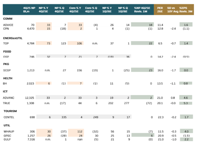 รายได้จากบริการมือถือ–อินเทอร์เน็ตกลุ่มสื่อสาร กำลังการผลิตไฟฟ้าใหม่ กำไรจากธุรกิจโรงไฟฟ้าต่างประเทศที่เพิ่มขึ้น สวนทางราคาต้นทุนก๊าซปรับลดลงของกลุ่มโรงไฟฟ้า และดีมานด์ AI/data center ยังแข็งแรงเป็นแรงส่งสำคัญ แม้ยังโดนกดดันจากกลุ่มพลังงานต้นน้ำ และปิโตรฯ รวมถึงส่วนต่างดอกเบี้ยกลุ่มธนาคารหดตัว/ราคาเนื้อสัตว์ จำนวนนักท่องเที่ยว ยอดขายที่ดินนิคมฯ ที่ลดลงกดดันเพิ่มเติม หากไม่รวมรายการพิเศษ กำไรหลักคาดออกมาเพิ่มขึ้น 11% YoY และ 1% QoQ