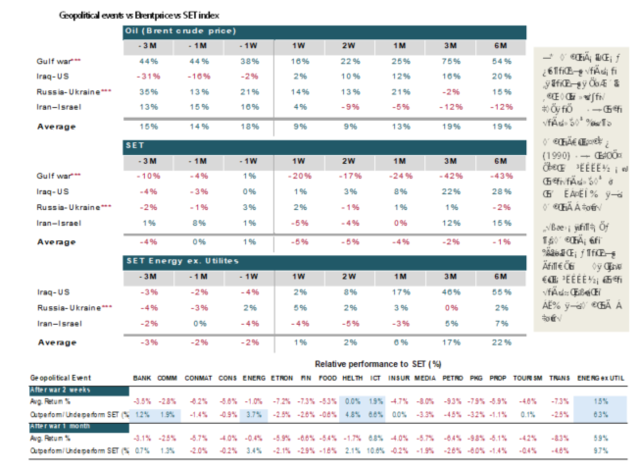 การยกระดับความตึงเครียดระหว่างสหรัฐฯ–อิหร่าน โดยเฉพาะการกดดันให้อิหร่านต้องบรรลุข้อตกลงนิวเคลียร์ภายในกรอบเวลา 10–15 วัน ได้ทำให้ความเสี่ยงเชิงภูมิรัฐศาสตร์กลับมาเป็นตัวแปรสำคัญของตลาดการเงินโลกอีกครั้ง ตลาดพลังงานตอบสนองทันที เนื่องจากภูมิภาคตะวันออกกลางมีบทบาทสำคัญต่อทั้งการผลิตและการขนส่งน้ำมันโลก ประวัติศาสตร์จากสงครามหลัก 4 ครั้ง ได้แก่ อิรัก–คูเวต (1990), สหรัฐฯ–อิรัก (2003), รัสเซีย–ยูเครน (2022) และอิหร่าน–อิสราเอล (2025) บ่งชี้ว่าราคาน้ำมันมักปรับขึ้นเฉลี่ยประมาณ 9% ภายใน 2 สัปดาห์แรกของเหตุการณ์ และหากสถานการณ์ยืดเยื้อหรือขยายวงกว้าง อาจเร่งตัวเป็น 13% ภายใน 1 เดือน อย่างไรก็ตาม แม้ราคาน้ำมันจะปรับขึ้นซึ่งดูเหมือนเป็นปัจจัยบวกต่อบางกลุ่มธุรกิจ แต่ตลาดหุ้นโดยรวมมักตอบสนองในเชิงลบจากแรงขายลดความเสี่ยง (risk-off) และความกังวลต่อผลกระทบทางเศรษฐกิจ ส่งผลให้ SET มีโอกาสปรับฐานราว 4–5% ในช่วง 1 เดือนแรก สะท้อนว่าความเสี่ยงภูมิรัฐศาสตร์สร้างความผันผวนเชิงจิตวิทยามากกว่าการหนุนตลาดโดยรวม