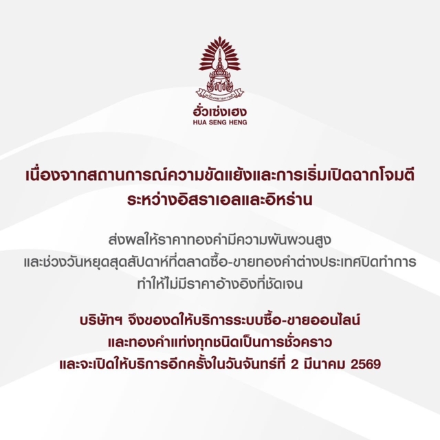 ในวันนี้ (28 กุมภาพันธ์ 2569) บริษัทฮั่วเซ่งเฮง กรุ๊ป ได้ออกประกาศแจ้งลูกค้าว่า จากสถานการณ์ความขัดแย้งและการเริ่มต้นโจมตีระหว่างอิสราเอลและอิหร่าน ส่งผลให้ราคาทองคำในตลาดโลกเกิดความผันผวนอย่างรุนแรง ประกอบกับช่วงวันหยุดสุดสัปดาห์ที่ตลาดซื้อขายทองคำต่างประเทศปิดทำการ ทำให้ไม่มีราคาอ้างอิงที่ชัดเจนสำหรับการกำหนดราคาทองคำภายในประเทศ