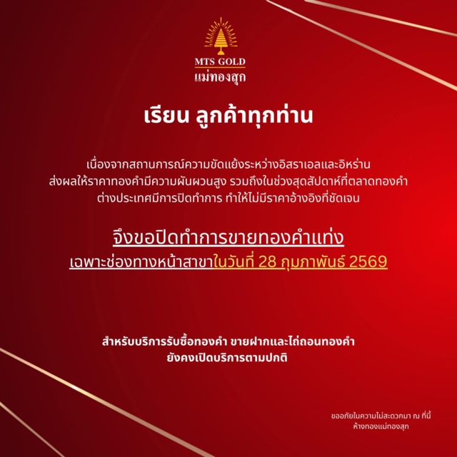 นอกจากนี้ การที่ตลาดทองคำต่างประเทศปิดทำการในช่วงสุดสัปดาห์ยังทำให้ไม่สามารถอ้างอิงราคากลางที่ชัดเจนได้ ส่งผลให้บริษัทตัดสินใจปิดทำการขายทองคำแท่งเฉพาะช่องทางหน้าสาขาในวันที่ 28 กุมภาพันธ์ 2569 เพื่อหลีกเลี่ยงความเสี่ยงจากความผันผวนของราคา