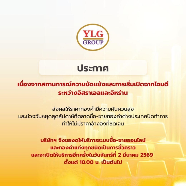 ทั้งนี้ YLG จะกลับมาเปิดให้บริการซื้อ-ขายทองคำอีกครั้งในวันจันทร์ที่ 2 มีนาคม 2569 ตั้งแต่เวลา 10.00 น. เป็นต้นไป
