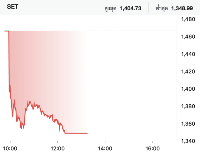 ระหว่างการซื้อขายภาคเช้า แรงเทขายขยายวงกว้าง ดัชนีไหลลงลึกจนแตะระดับ 1,348.99 จุด ลดลง 117.52 จุด หรือคิดเป็น -8.01% จากวันทำการก่อนหน้า เข้าเกณฑ์ Circuit Breaker Level 1 เมื่อเวลา 12.18 น.