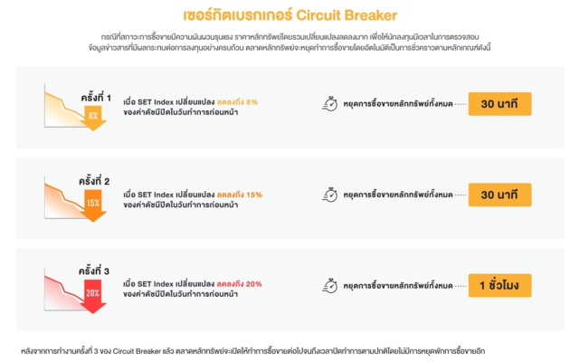 ตลาดหลักทรัพย์แห่งประเทศไทยจึงประกาศหยุดการซื้อขายหลักทรัพย์ในตลาดหลักทรัพย์แห่งประเทศไทย (SET) และตลาดหลักทรัพย์เอ็มเอไอ (mai) รวมถึงหลักทรัพย์ในตลาดสัญญาซื้อขายล่วงหน้า ทั้ง Index Futures, Index Options และ Single Stock Futures เพื่อเปิดโอกาสให้ผู้ลงทุนได้มีเวลาพิจารณาข้อมูล ประเมินสถานการณ์ และตัดสินใจลงทุนได้อย่างรอบคอบ ก่อนจะเปิดซื้อขายภาคบ่ายตามปกติในเวลา 14.00 น.