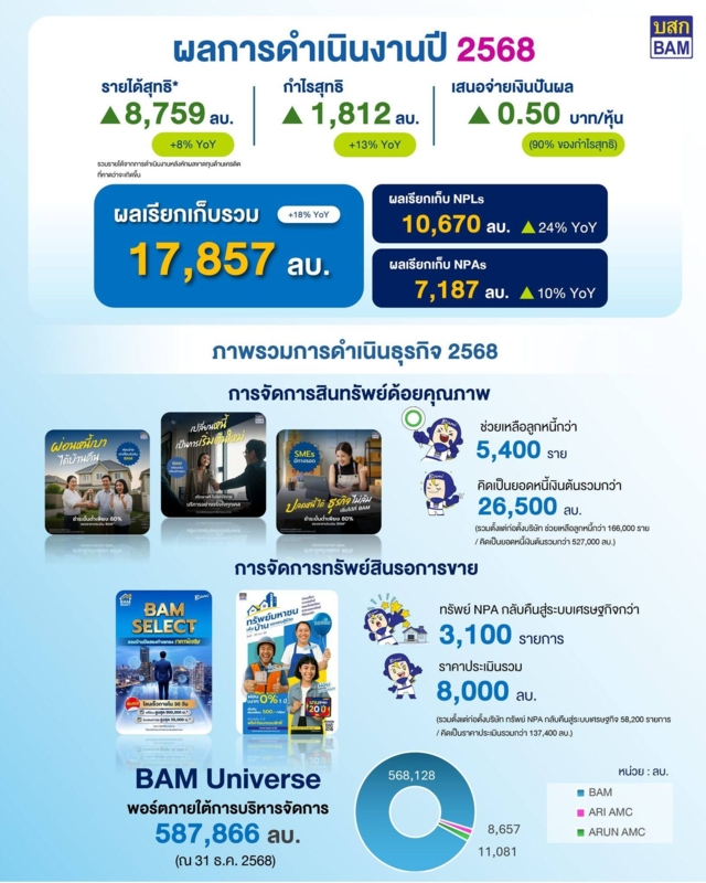 ท่ามกลางเศรษฐกิจที่เต็มไปด้วยความไม่แน่นอน ทั้งแรงกดดันจากภาวะเศรษฐกิจชะลอตัว ความผันผวนของตลาดการเงิน ไปจนถึงความเสี่ยงจากสถานการณ์ความขัดแย้งและสงครามในหลายภูมิภาค บริษัทบริหารสินทรัพย์ กรุงเทพพาณิชย์ จำกัด (มหาชน) หรือ BAM กลับสามารถแสดงให้เห็นถึงความแข็งแกร่งของโมเดลธุรกิจในการบริหารสินทรัพย์ด้อยคุณภาพ โดยผลการดำเนินงานในปี 2568 สามารถสร้างผลเรียกเก็บได้สูงถึง 17,857 ล้านบาท เพิ่มขึ้นจาก 15,161 ล้านบาทในปีก่อนหน้า หรือเติบโต 18% สะท้อนศักยภาพการบริหาร NPL และ NPA ได้อย่างมีประสิทธิภาพแม้อยู่ในภาวะเศรษฐกิจที่ผันผวน
