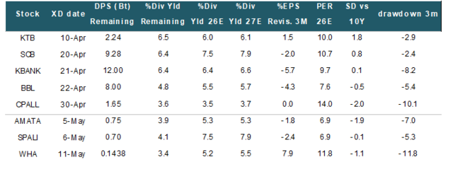 ในระยะสั้น เรามองว่าสถานการณ์สงครามยังอาจทำให้ ตลาดหุ้นผันผวนสูงต่อเนื่อง ภาวะดังกล่าวเปิดโอกาสเชิงกลยุทธ์ในการ ทยอยสะสมหุ้นปันผลสูง ที่การปรับตัวลงของราคา (drawdown) ไม่รุนแรงเทียบดัชนี SET แม้ในช่วงที่ตลาดเผชิญแรงขายจากความกลัวสงคราม กำลังเข้าสู่รอบการจ่ายเงินปันผลในช่วง 1–3 เดือนข้างหน้า (ก่อนขึ้นเครื่องหมาย XD) ความเสี่ยงผลกระทบจากสงครามจำกัด และคาดฟื้นตัวเร็วหลังสงครามคลี่คลาย เช่น KTB (2.24 บาท, 6.5%), SCB (9.28 บาท, 6.4%), KBANK (12 บาท, 6.4%), BBL (8 บาท, 4.8%), CPALL (1.65 บาท, 3.6%), AMATA (0.75 บาท, 3.9%), SPALI (0.7 บาท, 4.1%), WHA (0.1438 บาท, 3.4%)