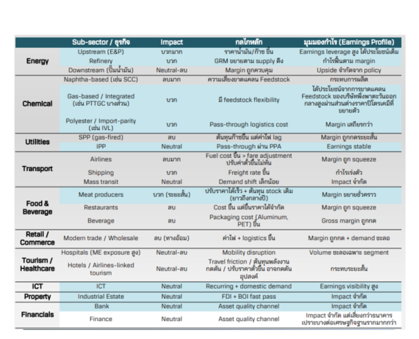 ผลกระทบจากสงครามต่อกำไรบริษัทจดทะเบียนไทยไม่ได้กดทั้งตลาด แต่กระจายตัวตามโครงสร้างต้นทุนและความสามารถในการส่งผ่านราคา ส่งผลให้เกิด “การย้ายกำไร” ระหว่างอุตสาหกรรมมากกว่าการหดตัวพร้อมกัน