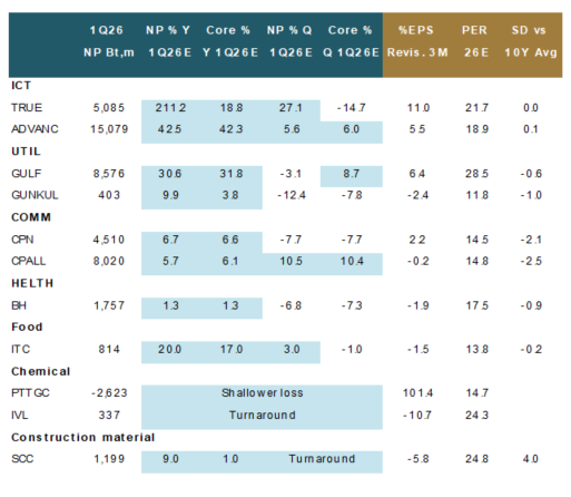 เน้น 4 ธีมหลัก ได้แก่ “Summer play-Domestic Pricing Power Plays” (ผู้นำธุรกิจในประเทศที่มีอำนาจส่งผ่านต้นทุน-หน้าร้อนหนุนกำไรเพิ่ม) CPALL, CPN, “Next-Gen Infrastructure & Digital Cycle” (วัฏจักรการลงทุนโครงสร้างพื้นฐานและเศรษฐกิจดิจิทัลยุคใหม่) สำหรับธุรกิจที่เชื่อมโยงกับ data center และโครงสร้างพื้นฐานระยะยาว (ADVANC, TRUE, GULF, GUNKUL), “Supply Disruption Beneficiaries” (ผู้ชนะจากภาวะอุปทานตึงตัวและวัฏจักรสินค้าโภคภัณฑ์รอบใหม่ แม้ความตึงเครียดภูมิรัฐศาสตร์เริ่มคลี่คลาย แต่ supply disruption ทำให้อุปทานในตลาดยังตึงตัว และต้องใช้เวลาในการฟื้นฟู ส่งผลให้ chemical spread มีแนวโน้มยืนสูงต่อเนื่อง หนุนการฟื้นตัวของกำไรใน 1Q26 และเร่งตัวเด่นใน 2Q26) PTTGC, IVL, SCC และ “Over-Penalized Recovery & Re-rating Plays” (หุ้นต่ำมูลค่าที่มีโอกาสฟื้นตัวและถูกประเมินมูลค่าเพิ่ม/ — ราคาหุ้นปรับตัวลงต่ำกว่าปัจจัยพื้นฐาน ขณะที่จำนวนผู้ป่วยต่างชาติมีแนวโน้มฟื้นตัวจาก pent-up demand หลังรอมฎอน (Ramadan) และความตึงเครียดภูมิรัฐศาสตร์คลี่คลาย ซึ่งจะเป็น catalyst ต่อการฟื้นตัวของกำไรและการ re-rating ในระยะถัดไป) BH, ITC