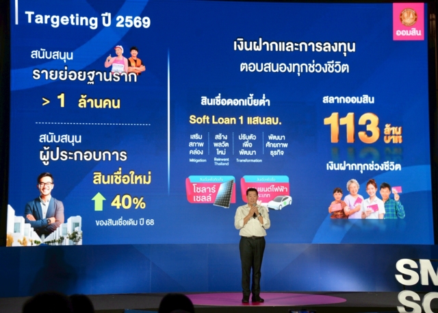 ผู้อำนวยการธนาคารออมสิน เปิดเผยทิศทางการดำเนินงานในปี 2569 ว่า ธนาคารออมสินตั้งเป้าสนับสนุนประชาชนฐานรากได้มากกว่า 1 ล้านคน เพิ่มสัดส่วนสินเชื่อใหม่แก่ผู้ประกอบการมากกว่า 40% ของสินเชื่อรวมในปี 2568 พร้อมกับเดินหน้าพัฒนาผลิตภัณฑ์ทางการเงินที่ตอบโจทย์ทุกช่วงชีวิต เช่น การเปิดจำหน่ายสลากออมสินพิเศษในโอกาสครบรอบก่อตั้งธนาคาร 113 ปี และผลิตภัณฑ์เงินฝากที่มีสิทธิประโยชน์ เช่น เงินฝากแบบมีประกันชีวิต/ประกันสุขภาพ เพื่อส่งเสริมการออมและสร้างความมั่นคงทางการเงินให้คนไทยในทุกมิติ