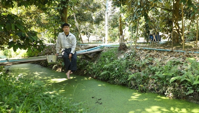 เขาเล่าต่อว่า เพราะเหตุนี้สวนทุเรียนลุงสมพงศ์จึงใช้น้ำประปารดต้นทุเรียนแทน โดยใช้ระบบมินิสปริงเกอร์วางรอบสวน และเปิดน้ำเพื่อรด การใช้วิธีนี้ นอกจากจะเร็วกว่า ยังคาดคะเนปริมาณได้แม่นยำกว่า และทำให้แน่ใจว่าน้ำสะอาดปลอดภัย เพราะเป็นน้ำที่รองมาพักไว้ในแทงก์แล้ว