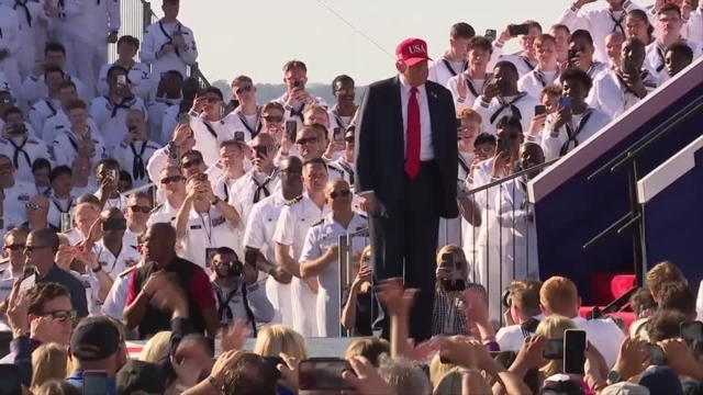 ทรัมป์กล่าวกับทหารเรือประมาณ 10,000 นายที่สวมเครื่องแบบสีขาวเต็มยศ "พูดกันตรง ๆ เลยนะ นี่มันคือการชุมนุมหาเสียงนั่นแหละ" เขายอมรับเองว่าคำพูดของเขานั้น เกือบจะกลายเป็นการหาเสียง ซึ่งเรียกเสียงเชียร์จากฝูงชนได้ ก่อนจะจบงานด้วยการเปิดเพลงประจำตัวของเขาคือเพลง “YMCA” ของวง Village People นี่คือบรรยากาศอันยิ่งใหญ่และมีชีวิตชีวาในพิธีดังกล่าว แต่การเมืองสหรัฐฯ ในขณะนี้ กลับไม่ได้ดูรุ่งโรจน์เหมือนกับการฉลองในครั้งนี้