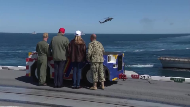 หลังจากมาถึง ทรัมป์ได้ไปที่เรือ USS George H.W. Bush พูดคุยกับทหารเรือและแจกเหรียญที่ระลึก จากนั้นทั้งสองก็ได้ชมการสาธิตทางทหาร บนดาดฟ้าเรือบรรทุกเครื่องบิน โดยมีเรือพิฆาตยิงขีปนาวุธและปืนใหญ่ลงทะเล หน่วยซีลโรยตัวจากเฮลิคอปเตอร์ และเครื่องบินขับไล่ดีดตัวออกจากเรือ