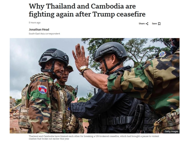 ล่าสุด คุณโจนาธาน เฮด ได้เขียนบทความถึงเหตุปะทะชายแดนไทย-กัมพูชารอบใหม่ ภายใต้หัวข้อข่าว “เหตุใดไทยและกัมพูชาจึงกลับมาสู้รบกันอีกครั้งหลังจากการหยุดยิงที่ทรัมป์เป็นคนกลางไกล่เกลี่ย” โดยเริ่มต้นบรรยายสถานการณ์ว่า “เสียงปืนใหญ่ จรวด และการโจมตีทางอากาศกลับมาดังกระหึ่มอีกครั้งตามแนวชายแดนไทย-กัมพูชา ชาวบ้านในหมู่บ้านหลายแห่งในแนวรบที่ทอดยาวหลายร้อยกิโลเมตรถูกสั่งอพยพเป็นครั้งที่สองในรอบ 5 เดือน ครอบครัวต่าง ๆ จำต้องอยู่ในที่พักพิงชั่วคราวอย่างสิ้นหวัง และไม่รู้ว่าเมื่อไหร่จะได้กลับบ้าน”